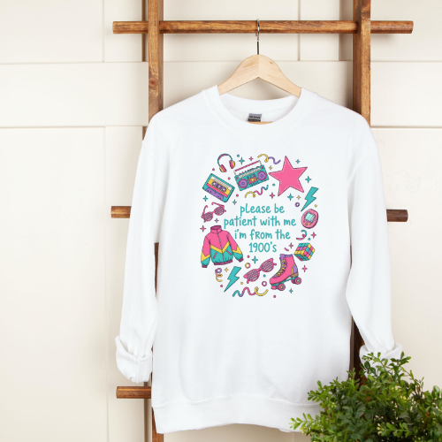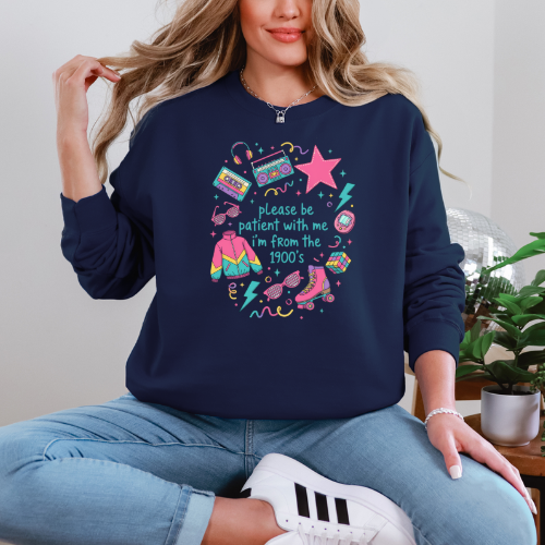 Rollerblades, tamagotchi's, cassette tapes, and boom boxes — this playful sweater is a nod to all things vintage and quirky. “Please Be Patient With Me, I Was Born in the 1900’s” is perfect for those who love nostalgia with a sense of humour. Soft cozy, comfy, and ideal for weekends or work-from-home vibes.