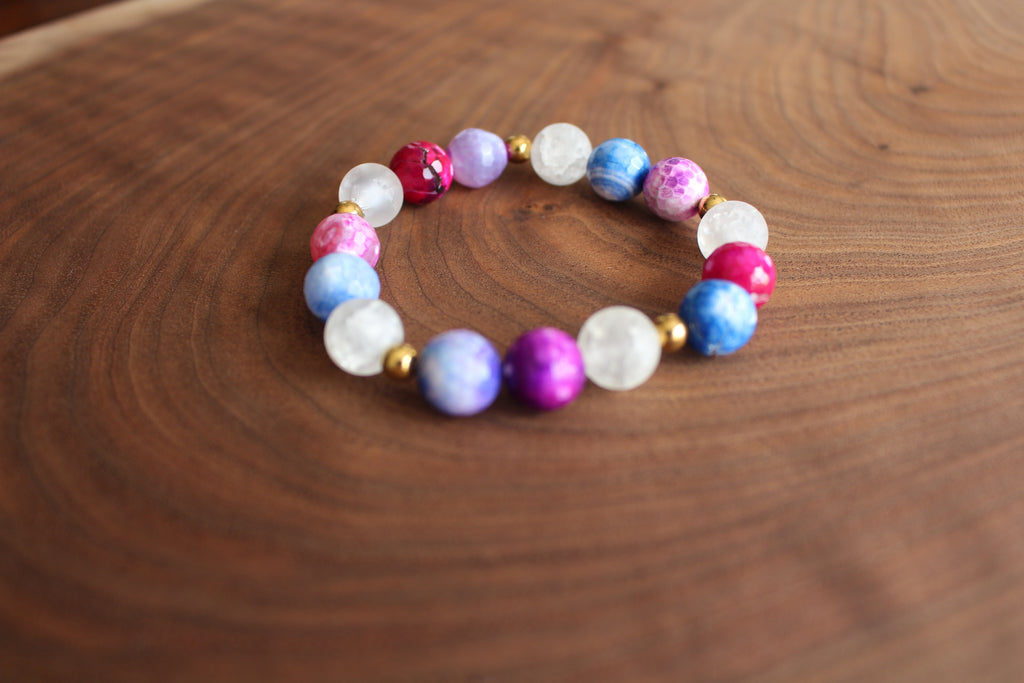 Purple, pink and blue agate beads mixed with white quartz beads and gold accents.