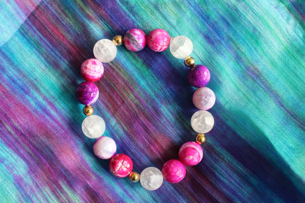 Pink and purple agate beads mixed with white quartz beads and gold accents.