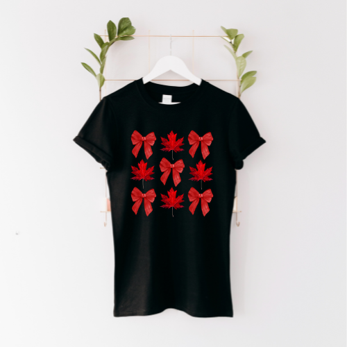 Cozy Canadian patterns come alive in this maple leaf and bow grid tee. Soft, lightweight, and perfect for winter outings, casual weekends, or gifting a friend.