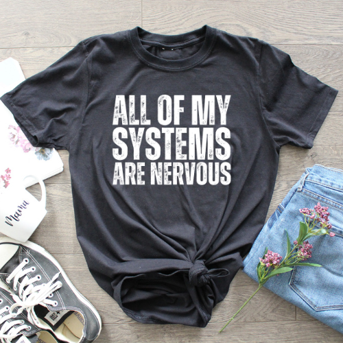 For days your brain won’t quit, this tee says it all. All My Systems Are Nervous in playful scuffled letters. Soft, lightweight, and perfect for layering or lounging.
